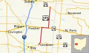 State Route 589 (SR 589) is a north–south state highway in the western part of the U.S. state of Ohio. SR 589's southern terminus is at SR 55 in the village of Casstown. The northern terminus of SR 589 is at a T-intersection with SR 29 approximately 5.50 miles (8.85 km) southeast of the city limits of Sidney.
