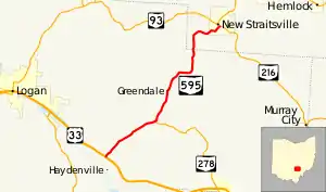 State Route 595 (SR 595) is a north–south state highway in southeastern Ohio, a U.S. state. The route's southern terminus is at a diamond interchange with the U.S. Route 33 (US 33) expressway approximately three and a half miles (5.6 km) southeast of Logan. Its northern terminus is at a T-intersection with SR 216 in New Straitsville, just two blocks southeast of SR 216's northern terminus at SR 93.