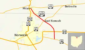 State Route 601 (SR 601) is a north–south state highway in North Central Ohio. A two-lane eastern bypass of Norwalk, SR 601 has its southern terminus at SR 18 southeast of Norwalk, adjacent to Summit Motorsports Park. The northern terminus of SR 601 is at SR 113 in downtown Milan, less than one-quarter mile (0.40 km) east of the junction of SR 113 and the U.S. Route 250 (US 250)/SR 13 concurrency.