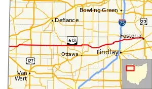 From the Indiana state line, State Route 613 follows a generally easterly direction through small towns such as Payne, Oakwood, and Continental. It shares a route with State Route 634 for 2 miles (3.2 km) before entering Continental. After Continental, the route continues east into Leipsic, then into McComb, where it shares a route with State Route 235 for a short distance.