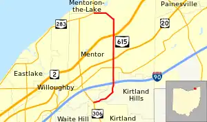 State Route 615 (SR 615) is a 6.93-mile-long (11.15 km) north–south state highway in the northeastern portion of the U.S. state of Ohio. SR 615 runs from its southern terminus at a signalized intersection with SR 306 in Kirtland to its northern terminus at a signalized intersection with SR 283 in Mentor-on-the-Lake.
