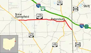 State Route 617 (SR 617) is a short east–west state route in northeastern Ohio, existing entirely within Springfield Township, Mahoning County. The western terminus of SR 617 is at SR 165 in the unincorporated community of New Springfield. Its eastern terminus is at the Pennsylvania State Line just southeast of the hamlet of Petersburg, where SR 617 turns into Pennsylvania Route 351 (PA 351).