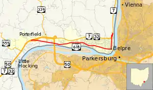 State Route 618 (SR 618) is a 7.45-mile (11.99 km) long east–west state highway in the southeastern quadrant of the U.S. state of Ohio. The western terminus of SR 618 is at an interchange with the concurrency of U.S. Route 50 (US 50), SR 7 and SR 32 about 3.25 miles (5.23 km) west of Belpre. Its eastern terminus is in northern Belpre at an interchange with SR 7.