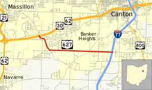 State Route 627 (SR 627) is a 4.76-mile (7.66 km) east–west state highway in Stark County, Ohio. SR 627's western terminus is at a diamond interchange with the US 30/US 62 freeway in southeast Massillon. Its eastern terminus is a diamond interchange with Interstate 77 at I-77 Exit 101 in southern Canton.