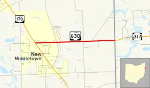 State Route 630 (SR 630) is a 2.56-mile-long (4.12 km) east–west state highway in the northeastern quadrant of the U.S. state of Ohio. The western terminus of SR 630 is at a signalized intersection with SR 170 in the northern end of the village of New Middletown. Its eastern terminus is at the Pennsylvania state line nearly two miles (3.2 km) east of New Middletown. Upon crossing the border, SR 630 becomes Pennsylvania Route 317 (PA 317), which continues east to Bessemer.