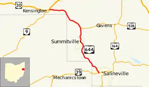 State Route 644 (SR 644) is a north–south state highway running through Columbiana and Carroll counties in northeast Ohio. Its southern terminus is at SR 39 in downtown Salineville, and its northern terminus is at its junction with U.S. Route 30(US 30) and SR 9 in the center of Kensington. The route connects mainly rural and a few unincorporated parts of southeastern Columbiana County. SR 644 only briefly passes into a corner of Carroll County for a 0.41-mile (0.66 km) journey.