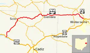 SR 646 begins at a stop-controlled intersection with US 250 in Stock Township, Harrison County; about 8 miles (13 km) northwest of Cadiz. The intersection is on the shoreline of Tappan Lake. The state route heads northeast towards Scio through a valley formed by a small creek. Once it reaches Scio, the route makes numerous turns, has a grade crossing with an Ohio Central Railroad and the Conotton Creek Trail, and shares a brief concurrency with SR 151. Upon exiting the village, SR 646 travels in a more easterly direction. The route heads through the hills of Appalachia passing through the villages of New Rumley, the birthplace of General George Armstrong Custer, and Germano. In Germano, SR 646 runs concurrent with SR 9 for about 0.6 miles (0.97 km). East of Germano, the road intersects County Road 51 (formerly a grade-separated interchange[2]) and an Ohi-Rail Corporation rail line.[3]