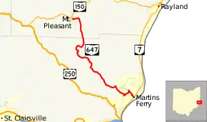 State Route 647 (SR 647) is a state highway in eastern Ohio connecting the city of Martins Ferry with the village of Mount Pleasant. 9.96 miles (16.03 km) in length, its southern terminus is at SR 7 and its northern terminus is at SR 150.
