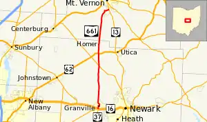 State Route 661 (SR 661) is a 22.22-mile (35.76 km) long north–south state highway in the central portion of the U.S. state of Ohio. The southern terminus of SR 661 is at a diamond interchange with SR 16 and SR 37 just 0.25 miles (0.40 km) south of Granville. SR 661 has its northern terminus at a signalized T-intersection with SR 13 in the southern end of Mount Vernon.