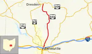 State Route 666 (SR 666) is a 14.17-mile (22.80 km) state route that runs between Zanesville and Dresden in the US state of Ohio. Most of the route is a rural two-lane highway and passes through both woodland and farmland. For much of its path, SR 666 runs generally parallel to the east of the Muskingum River. The highway was first signed in 1937 on the same alignment as today. The whole highway was paved by 1955.