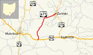 State Route 677 (SR 677) is a nearly 5-mile-long (8.0 km) north–south running state route existing entirely in Vinton County, Ohio. Its southern terminus is at US 50, slightly to the east of McArthur in Elk Township, and its northern terminus is at SR 278 in Zaleski. The route passes through rural east-central Vinton County while connecting the two towns. Locally, the route is known as Powder Plant Road, as an Austin Powder Company explosives plant lies along the route.