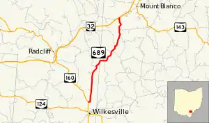 State Route 689 (SR 689) is a north–south state highway in the southern portion of the U.S. state of Ohio. Its southern terminus is at SR 160 a mile north of Wilkesville, and its northern terminus is at SR 32 about 6 miles (9.7 km) southwest of Albany.