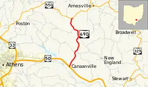 State Route 690 (SR 690) is a north–south state highway in southeastern Ohio, a U.S. state. The southern terminus of SR 690 is at the concurrency of US 50 and SR 32 about 6+1⁄2 miles (10.5 km) east of Athens in the community of Canaanville. Its northern terminus is at SR 550 approximately two miles (3.2 km) west of Amesville.