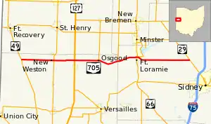 State Route 705 (SR 705) is a state highway in western Ohio, a U.S. state. The highway's western terminus is in rural northwestern Darke County at SR 49 approximately 5.25 miles (8.45 km) southeast of Fort Recovery, and just a mile south of the Darke-Mercer County Line. Its eastern terminus is at SR 29 nearly 2.75 miles (4.43 km) northwest of Sidney.