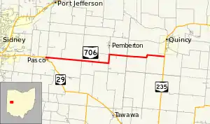 State Route 706 (SR 706) is an east–west state route in western Ohio. The western terminus of SR 706 is at SR 29 in the hamlet of Pasco, and its eastern terminus is at a T-intersection with SR 235 just south of Quincy.