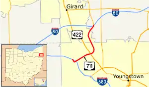 State Route 711 (SR 711), also known as the "Robert E. Hagan Memorial Highway" between its southern terminus and US 422,[2] is a three-mile (5 km), four-lane, north–south, limited access freeway. It is located in Mahoning and Trumbull counties. Its termini are I-680 to the south and the I-80 / SR 11 interchange to the north. The north-end ramps are directional, only serving travelers to and from the east via Interstate 80 and the north via State Route 11.