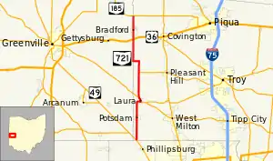 The SR 721 designation was assigned in 1937. Throughout its history, the route has maintained the same alignment in the general vicinity of the boundary between the counties of Darke and Miami. Originally, SR 721 was an unpaved roadway from its southern terminus at SR 49 to its junction with US 36. The portion from that point through Bradford to its northern terminus at SR 185.[2][3] One year after its assignment, SR 721 was paved between SR 49 and Laura.[5] By 1940, the remaining gravel portion of the highway between Laura and US 36 was paved.[6][7]