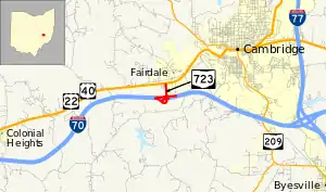 State Route 723 (SR 723) is a very short state highway located in east-central Ohio. Having a length of just 0.85 miles (1.37 km) and located just southwest of Cambridge, the route serves as a connector between Interstate 70 (I-70) at its exit 176 and the concurrency of U.S. Route 22 (US 22) and US 40.