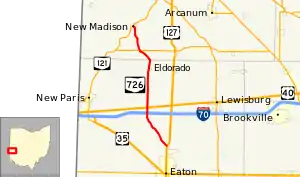 State Route 726 (SR 726) is a north–south state highway in western Ohio, a U.S. state. The southern terminus of the state route is at a T-intersection with US 127 about 1 mile (1.6 km) north of the city limits of Eaton. The northern terminus of SR 726 is at a signalized intersection with SR 121 in downtown New Madison.