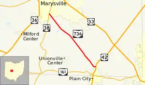 State Route 736 (SR 736, OH 736) is a northsouth state highway in the central portion of the U.S. state of Ohio. Its southern terminus is at U.S. Route 42 (US 42) near Plain City, and its northern terminus is at a T-intersection with SR 38 in Marysville.