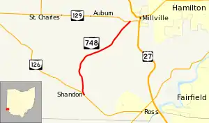 State Route 748 (SR 748) is a north–south state highway in southwestern Ohio, a U.S. state. Situated in west-central Butler County, SR 748 has its southern terminus at SR 126 in the unincorporated community of Shandon. Its northern terminus is at SR 129 near Millville, just one-half mile (0.80 km) west of SR 129's junction with U.S. Route 27.