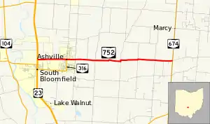 State Route 752 (SR 752) is an east–west state highway in the south-central portion of Ohio. The western terminus of SR 752 is at a signalized T-intersection with US 23 on the north edge of South Bloomfield, and its eastern terminus is at SR 674 about 7 miles (11 km) east of Ashville on the Pickaway-Fairfield County Line.