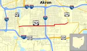State Route 764 (SR 764) is an east–west state highway in the northeastern portion of the U.S. state of Ohio. Existing entirely within the city of Akron, SR 764 has its western terminus at a signalized intersection with SR 93. Its eastern terminus is also at a signalized intersection, this time with SR 241. The highway serves Akron Fulton International Airport and the Rubber Bowl.