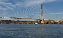 SR 775 begins on the East Huntington Bridge over the Ohio River at the West Virginia state line.[4][5] Here, SR 775 has its highest traffic counts; the road has an average annual daily traffic (AADT) of 18,520 vehicles based on a 2012 Ohio Department of Transportation (ODOT) survey.[6][7] The route heads north leaving the bridge and having an intersection with SR 7. SR 775 and SR 7 head northeasterly concurrent leaving Proctorville. The road passes near commercial and residential properties, as a three-lane highway, two-lane northbound and one-lane southbound. The highway has a traffic signal with Lawrence County Road 430 (CR 430), before becoming a two-lane highway. North of CR 403, the highway passes near residential properties and some woodland. In rural Lawrence County, SR 775 leaves SR 7 and heads towards the north-northwest. The route passes through woodland, with some houses, as a two-lane highway. The highway has a brief concurrency with SR 217, before entering the Wayne National Forest. The highway has an intersection with SR 141, at this intersection SR 775 turns northeasterly.[4][5] North of SR 141, the AADT of SR 775 drops to 200 vehicles.[6][7] The road has a T-intersection with SR 790, before turning towards the northwest and entering Gallia County. In Gallia County the highway begins to curve the north, before curving to the northeast. SR 775 has its northern terminus at a T-intersection with SR 141, in the Wayne National Forest.[4][5] The only section of highway that is concurrent with SR 7 is incorporated within the National Highway System (NHS).[8]