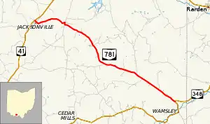 State Route 781 (SR 781) is an east–west state highway in southern Ohio, a U.S. state. The western terminus of SR 781 is at SR 41 about 2+1⁄2 miles (4.0 km) southwest of Peebles in the unincorporated community of Jacksonville. Its eastern terminus is eleven miles (18 km) to the southeast at a T-intersection with SR 348, which is approximately five miles (8.0 km) northeast of the community of Wamsley.