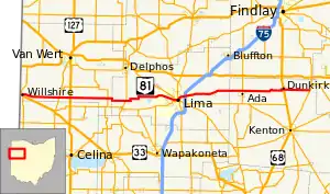 State Route 81 (SR 81) is an east–west route in western Ohio. Its western terminus is at the Indiana state line near Willshire (the route continues as State Road 124), and its eastern terminus is at SR 53 in Patterson. The route also goes through or close to the towns of Elgin, Lima, Ada, and Dunkirk.[5]