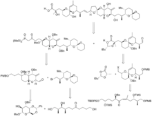 Similar to Isobe's synthesis, the Forsyth synthesis sought to reduce the number of steps, and to increase potential for designing analogues late in the synthesis. To do this, Forsyth et al. designed the synthesis to allow for structural changes and installation of important functional groups before large pieces were joined. Their resulting synthesis was 3% yielding, with 26 steps in the longest linear sequence. As above, spiroketalization was performed thermodynamically with introduction of acid.[5][14]