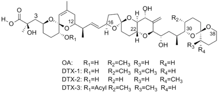 - 1 2 3 Yasumoto, T.; Murata, M.; Oshima, Y.; Sano, M.; Matsumoto, G. K.; Clardy, J. (1985). "Diarrhetic shellfish toxins". Tetrahedron. 41 (6): 1019–1025. doi:10.1016/s0040-4020(01)96469-5.