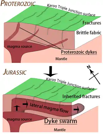 Also, Proterozoic dykes and fractures present in the crust may control the orientation of dyke intrusion.[4] When igneous intrusions occurred during the Karoo magmatism in the Jurassic period, they follow the directions of previous dykes. The number of Jurassic dykes accumulates, hence a giant dyke swarm can be developed in the region.