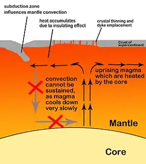 The lack of movement of the Gondwana supercontinent creates insulating effect to the sub-continental mantle. It may create significant impact to convection and temperature within the mantle.[4] As the mantle is insulated by the thick subcontinental crust, heat accumulates and mantle temperature underneath the crust increases. Hence the temperature gradient between the mantle near core and lithosphere decreases, and convection cannot be sustained. The high temperature in the lithosphere causes crustal thinning and intrusions.