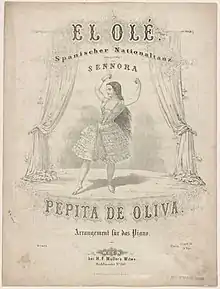 The origin of the word olé is uncertain. A popular idea is that the word comes from Allāh,[2] the Arabic word for God, perhaps as wa Ilâh (by God), or yāllāh (O God).[3] It was believed that the presence and power of God could be glimpsed through an exceptional performance, for example in a flamenco dance.[4][5] It has also been argued that when Flamenco dancers chant the word in cante jondo, they were reciting the beginning of the Shahada ("la illaha illa Allah") and that they were performing a Muwashshah.[6][7] The linguist Joan Coromines in his Diccionario crítico etimológico castellano e hispánico links olé to the Spanish word for "hello" hola and hala.[8] Hola has also been proposed to have come from Arabic.[3] However, the suggested derivations from Arabic of both olé and hola are disputed and they are described by the Spanish Arabist Federico Corriente as "falsos arabismos" (false Arabisms) in his work Diccionario de arabismos y voces afines en iberorromance.[3][9] The Spanish dictionary Diccionario de la lengua española that stated the wa Ilâh origin of olé in its earlier editions has removed the claim since 2001.[3]