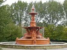 It had originally been displayed at the Great Exhibition of 1862, one of a pair at the entrance to the Royal Horticultural Society's 22 acres (8.9 hectares) gardens at South Kensington. John Samuel Wanley Sawbridge Erle-Drax bought the fountain for £3,000 and moved it to Olantigh.[31][32][33][1][10]