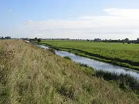 Vermuyden's Drain or the Forty Foot Drain was constructed in 1651 to drain fenland to the north of Chatteris. It was joined by the Cranbrook Drain just before it joined the Old Bedford River at Welches Dam.[20] There is a third channel between the Bedford Rivers, which is now known as the River Delph. It begins near where Vermuyden's Drain ends, and runs parallel to the Old Bedford River for most of its length, before crossing the washland to join the New Bedford River at Welmore Lake Sluice, 1.75 miles (2.8 km) above Denver Sluice.[21] Its history is obscure, as its construction does not appear to have been documented. It was built some time after the Bedford Rivers,[22] and at some point, a bend was added to the Old Bedford River at Welches Dam. This probably occurred after 1789, when C N Cole's map of the Bedford Level showed the original straight course, and before 1821, when R G Baker's map of Cambridgeshire showed it with the bend.[23] Blair offers an explanation, although he admits that it is conjectural. After Vermuyden's Drain was cut, it was found that water could flow up the Old Bedford River, rather than down it towards Denver. Edmund Welche, an engineer who worked with Vermuyden, then built a dam across the Old Bedford River just upstream of the junction. This resulted in water flowing down the Old Bedford River flooding the washes, and so the River Delph was cut. The Old Bedford River was slewed sideways to join the new channel, and a bank was built between the Delph and the downstream portion of the Old Bedford River to maintain the integrity of the washland.[17] Cole writing in 1784 stated that the purpose of the Delph was to make emptying of the washland easier.[22] This has resulted in the Old Bedford River having two sections, which are not connected together. The upstream section flows down from Earith to Welches Dam, and then flows into the River Delph. The Counter drain which runs to the west of the upstream section has a similar kink in it where it joins Vermuyden's Drain, and they then flow into the downstream section of the Old Bedford River, which joins the tidal Great Ouse at Old Bedford Sluice near Denver.[24]