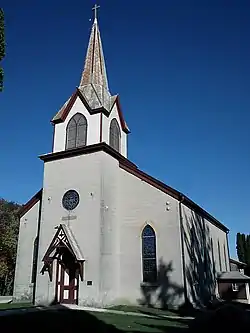 The main church follows a rectangular plan, measuring 64 by 44 feet (20 by 13 m).[3] The exterior is composed of locally quarried limestone covered with stucco. The projecting central pavilion is capped with a frame bell chamber and spire that rises to a height of 100 feet (30 m). The main entrance, also located in the central pavilion, is located within an elliptical arch that is framed by a Gothic portico. The side elevations feature five lancet windows that are symmetrically placed.