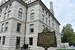 Many companies were involved in the building's construction, and are listed on two marble plaques in the main entrance hall of the courthouse.[1] The Superintendent of Construction was the Lexington company of J.R. Williamson, while the actual construction was completed by contractors Howard & Clark, also of Lexington. Most significantly, the brickwork and much if not all of the masonry was laid by Tandy & Byrd of Lexington, a prominent and very successful African-American building firm; since 2020 the Cheapside Park adjacent to the west façade of the courthouse has been named Henry A. Tandy Centennial Park in honor of one of its named partners.[8][9] A state historic marker next to the courthouse celebrates Tandy and his son, Vertner Woodson Tandy, who later became the first African-American architect in the state of New York.
