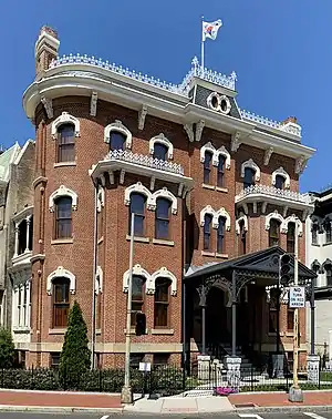 On December 16, 1877, Seth Ledyard Phelps was issued a permit to construct a seven-bedroom home at 15 Iowa Circle, a park and traffic circle in the present-day Logan Circle neighborhood of Washington, D.C.[1][2] Thomas M. Plowman was selected to design the 6,300 sq ft (585 sq m) brick residence and it was built by Joseph Williams at a cost of $5,500.[3] It was adorned with a tin roof, decorative railing, cast metal porch, and Ohio sandstone, and included a basement and projecting bays.[1][4][5] Phelps was a military officer who served in the Navy during the Mexican–American War and Civil War, and during his later years was president of the local Board of Commissioners and minister to Peru.[3]
