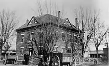 The second courthouse was a three-story brick building built in 1861. It was located in the approximate location of the existing Old McDonald County Courthouse in the center of the town square. The top story was reserved for the Freemasons, though the main lodge room was apparently never used for this purpose. The anteroom on the third floor, however, was rented for circuit and county clerk's office space.[2] During the Civil War, McDonald County faced a tumultuous period, with residents' alliances split between the Union and the Confederacy. The result of this led the rise of bushwackers in the area.[3] In August or September 1863 the courthouse was burned during an attack by bushwackers from south of town, led by a local man named Bill Hinson,[2] destroying most of the county's records.[3] The only records believed to be saved from the fire were a few carried away by County Clerk Absolem Applebee (A.A.) Hensley (1810-1882).[4]