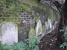 Gravestones are located around the perimeter of the walls of the gardens; the walls themselves are Grade II listed,[4] and were on the Heritage at Risk Register.[5] Following restoration work in 2021, they have been removed from the register.[6]