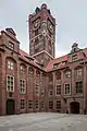 The present shape of the city hall is a result of an extensive construction project from the years 1391-1399, carried out in the Gothic style, probably under the direction of the Polish town constructor, master Andrew, based on the privilege of grand master Konrad von Wallenrode from 1393 (the privilege was issued during the construction). Old commercial buildings were demolished at that time, leaving only the tower. The administrative, commercial and judicial functions were combined in one building, which was a unique solution in Europe at the time. The city hall took the form of a four-winged building on a 44 × 52 m rectangular plan, with an internal courtyard accessible through four gates in the middle of each wing. The tower was based on the Flemish beffroi towers.[1] It was covered with a high Gothic roof (destroyed in 1703), which was a distinctive element of the former skyline of the city.