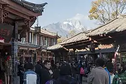 Shops along the street with Jade Dragon Snow Mountain in the background