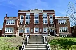 The main block was built in 1909-13 to a design by Freeman, Funk & Wilcox, an architectural firm based in Brookline, Massachusetts, and is one of its few known examples of educational architecture. The Collegiate Gothic style they chose is also uncommon in Maine, and typically appears only on college campuses. The wings were both designed by the Augusta firm of Bunker & Savage, specialists in educational architecture. Funding for the additions was provided by the federal Works Progress Administration. It was the city's second high school (and first after incorporation as a city), the first having been opened in 1876. It served as the city's high school until 1964, and then as its junior high school. The junior high was moved to new facilities in the 1970s, after which the building housed administrative offices and other education-related uses.[2] It has since been redeveloped to primarily house low-income residents.