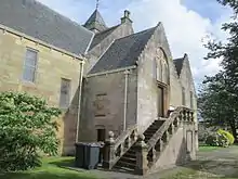 The Old West Kirk of the Church of Scotland, authorised by a 1589 Royal Charter and first opened in 1591, is noted as the first Presbyterian church built in Scotland following the Scottish Reformation, and the first approved by the Parliament of Scotland. At an early stage, east and west aisles were added as transepts, giving the church its cruciform plan.[1][2]