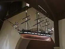 From 1711, John Scott began shipbuilding on the opposite bank of the Westburn, and from 1740 onwards shipyards increasingly encroached on the land between the Kirkyard and the Clyde. Caird & Company took over two shipyard berths close to the church in 1871, and photographs show ships under construction looming high above the kirk.[38] In 1917 Caird & Co. were taken over by Harland and Wolff, which proposed huge expansion of the shipyard, taking over several properties including the original harbour, the kirk and the kirkyard. They offered generous compensation, including a new site about 0.5 miles (0.80 km) further west along the coast at the east end of Greenock's Esplanade, and agreed to have the kirk carefully taken down and re-erected.[39][40] This was done under the supervision of the architect James Miller. A new tower was built to Miller's design,[3] and the church was reoriented, so that the Cartsburn Aisle and the main entrance, which had originally faced west, now faced north-east.