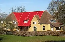 The large directors residence, situated north of the observatory itself, has an irregular appearance, featuring a front dormer, both hipped and half-hipped roofs, side dormers oriel and porch. The building is plastered and has a characteristic tiled roof. The original overall room structure has been preserved, although some changes was made, when it was turned into a guest house in 2012. There are four apartments in all, named after the astronomers Aristotle, Brahe, Kopernikus and Kepler.[4][5]