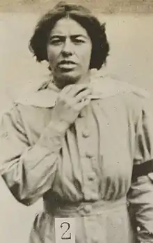 The National Portrait Gallery has a picture of her by the Criminal Record Office, and two pages of "Surveillance Photograph of Militant Suffragettes", also by the Criminal Record Office, which includes her.[3] Her picture was taken from a concealed car in the prisoners' exercise yard using an 11 inch powerful lens which had been purchased by the Home Office. The secret pictures were required because the suffragettes would distort their faces when conventional mug shots were being taken. The Home Office was worried by the impact of their arson and vandal attacks and they were closing art galleries.[5]