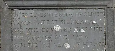 Oliver Grace died on 8 June 1708 and is buried in the south wing of Arles Church (or Grace's Chapel) of which he was the founder.[7]